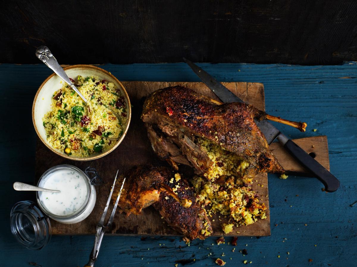 Christmas Whole roast goose with Persian couscous and mint yoghurt